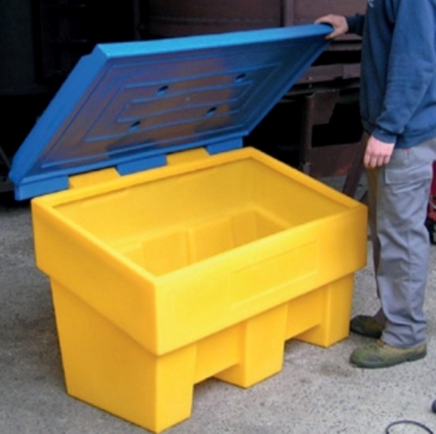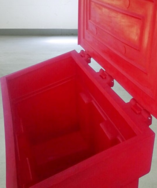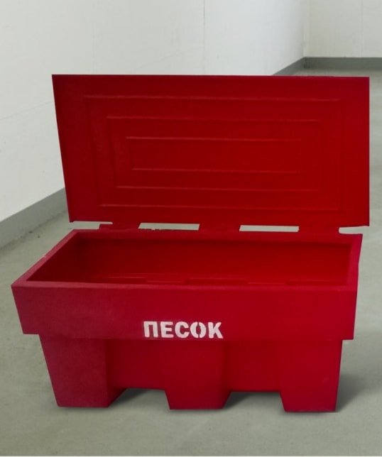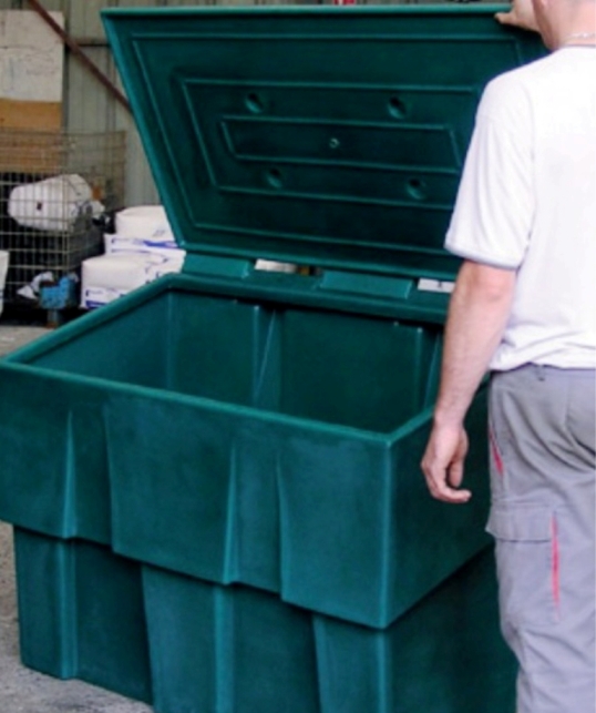 Пластиковый ящик (контейнер) широкого спектра применения для песка и песчано-солевой смеси, сорбента, хранения запаса кормов, зерна и прочих сыпучих веществ, требующих удобного хранения и использования веществ, а также укрытия их от осадков и влаги. Может применяться для содержания запасов воды, других жидкостей, компостирования и т.д.
